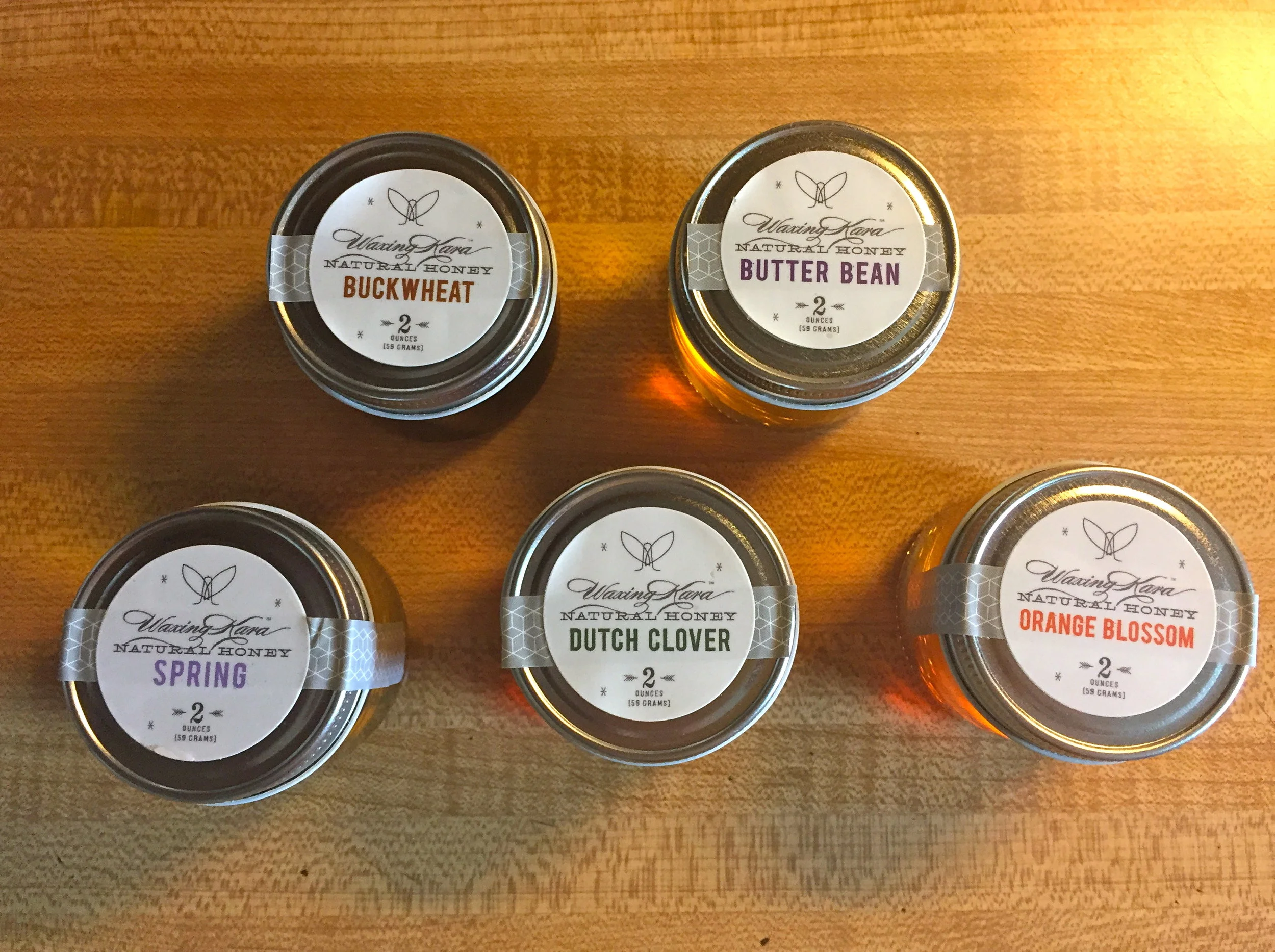 Different honey varieties from Waxing Kara's Honey House in Maryland that carries honey from the Eastern Shore. Her honeys and products are sold at The Pearl Spa in Fulton, MD or can be ordered online.
